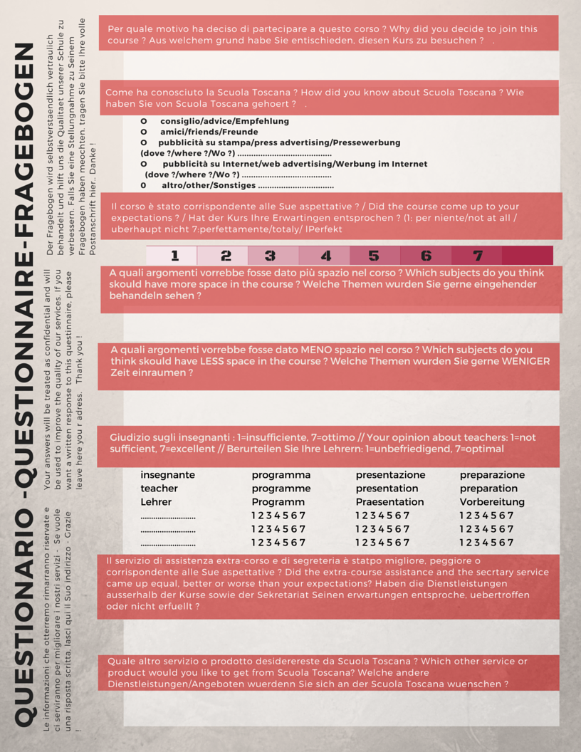 We at Scuola Toscana value the student’s opinion, about the school, the courses, the activities, the secretary. That’s why at the end of the course every student is kindly requested to fill in our questionnaire.