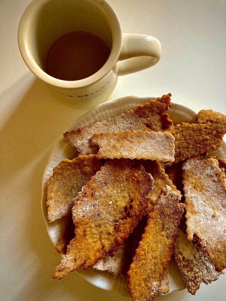 Sabato d’inverno, 4 gradi, sole, aria trasparente che sembra di essere in alta montagna. Giratina semiprofessionale a Vaglia, nel Mugello per scattare foto al mercato locale – chiacchierata con esperti di panificazione – il premio per una mezza giornata di lavoro: questi “cenci”, dolce tipico toscano di Carnevale, farina uova burro e vinsanto al posto del lievito. Ma questa versione è interessante, perché anziché farina 00 per l’impasto si usa al 50% la farina di castagne – e niente zucchero. Tutta e sola la dolcezza viene dalla farina di castagne : una ricetta antica che si adatta ai palati più moderni.